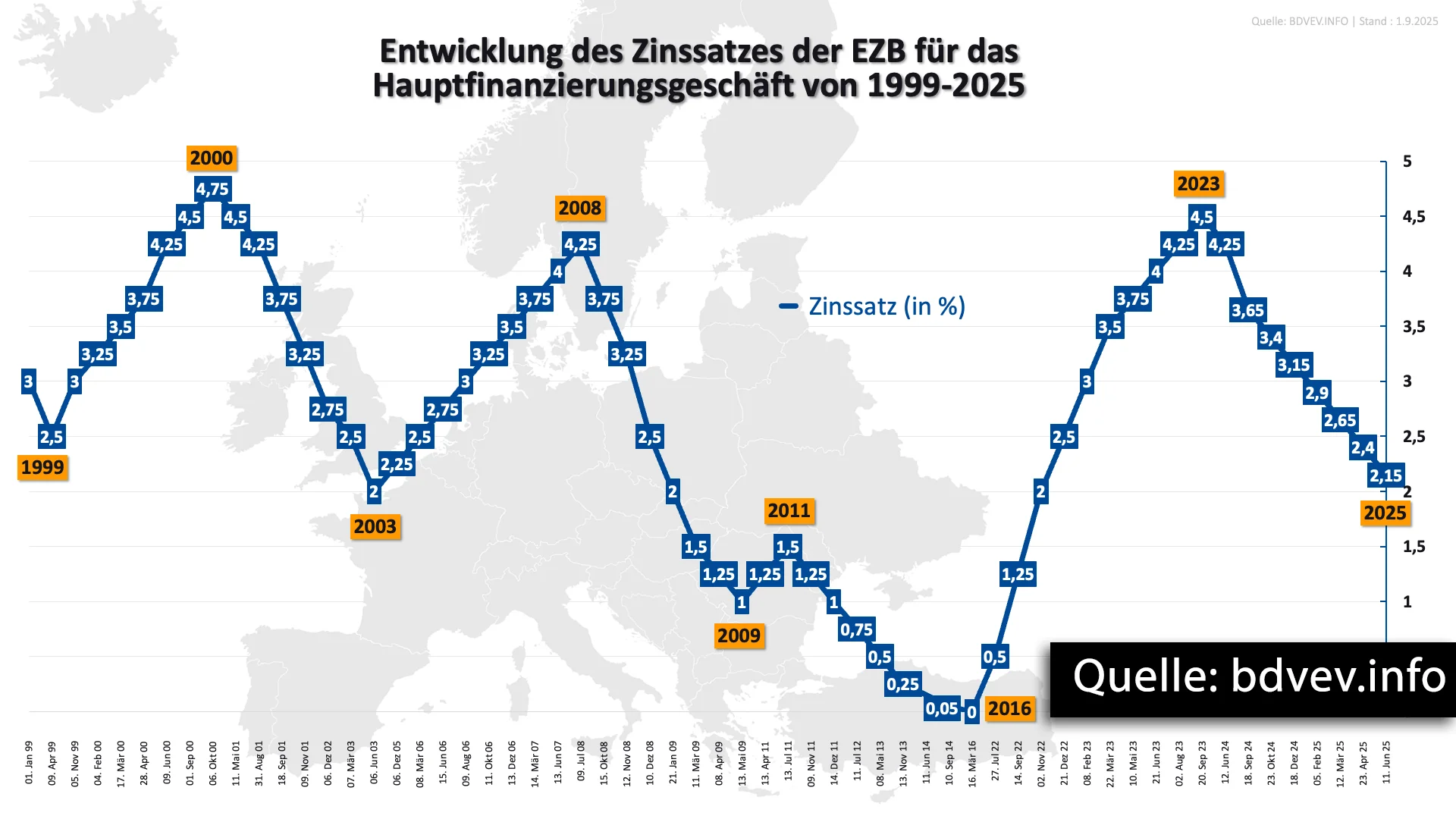 Trotz achtmaligen Senkens des Leitzinses zur Ankurbelung der Wirtschaft zieht die Inflation wieder an. Die Rate stieg sukzessive von 2,0 % im Juli 2024 auf 2,4 % im September 2025. Dieser Trend bestätigt die Vorhersagen von Experten wie Hans-Werner Sinn über die Folgen der Geldvermehrung. Der Anstieg demonstriert die schleichende Enteignung von Sparguthaben und verdeutlicht die Dringlichkeit, Vermögenswerte mittels des RüVER-Stresstests auf Krisenfestigkeit zu prüfen.