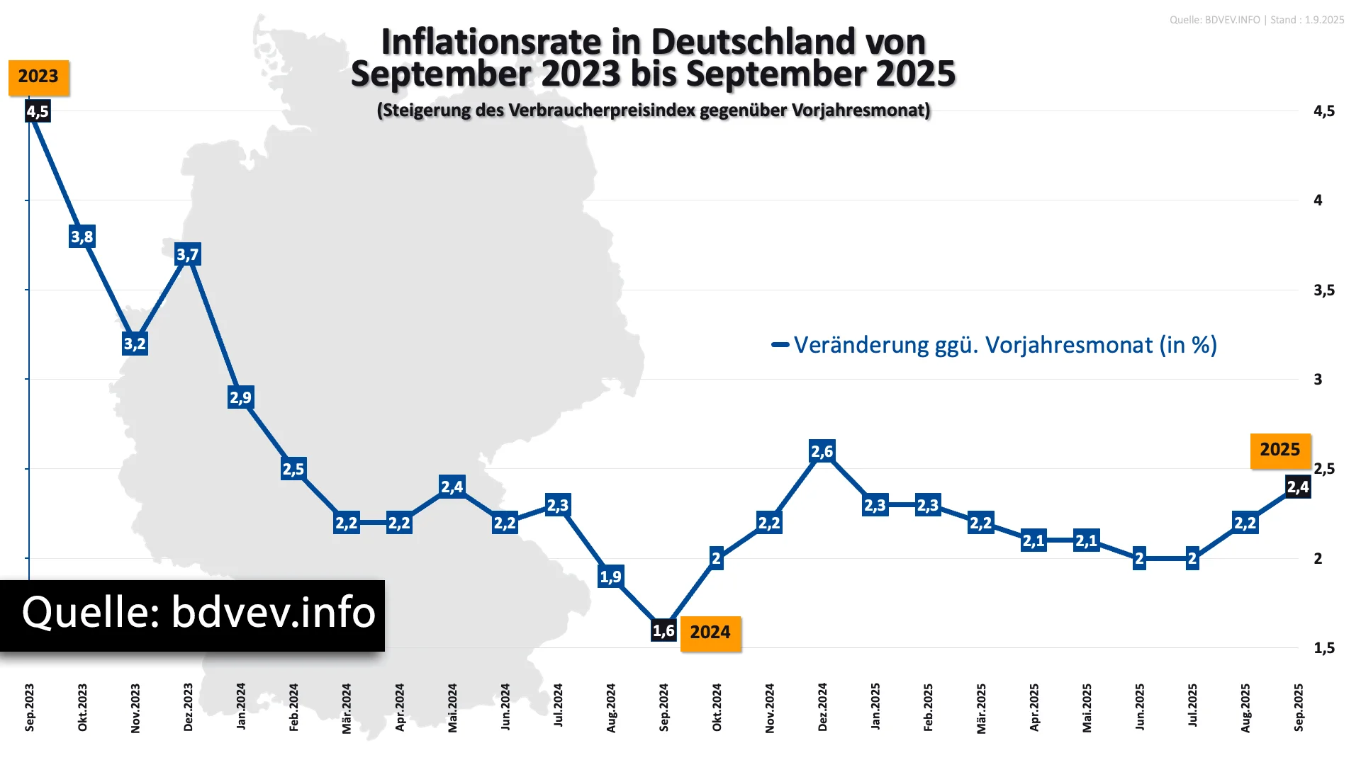 - Aktuelle Zahlen: Die Rate stieg von 2,0 % im Juli über 2,2 % im August auf 2,4 % im September.